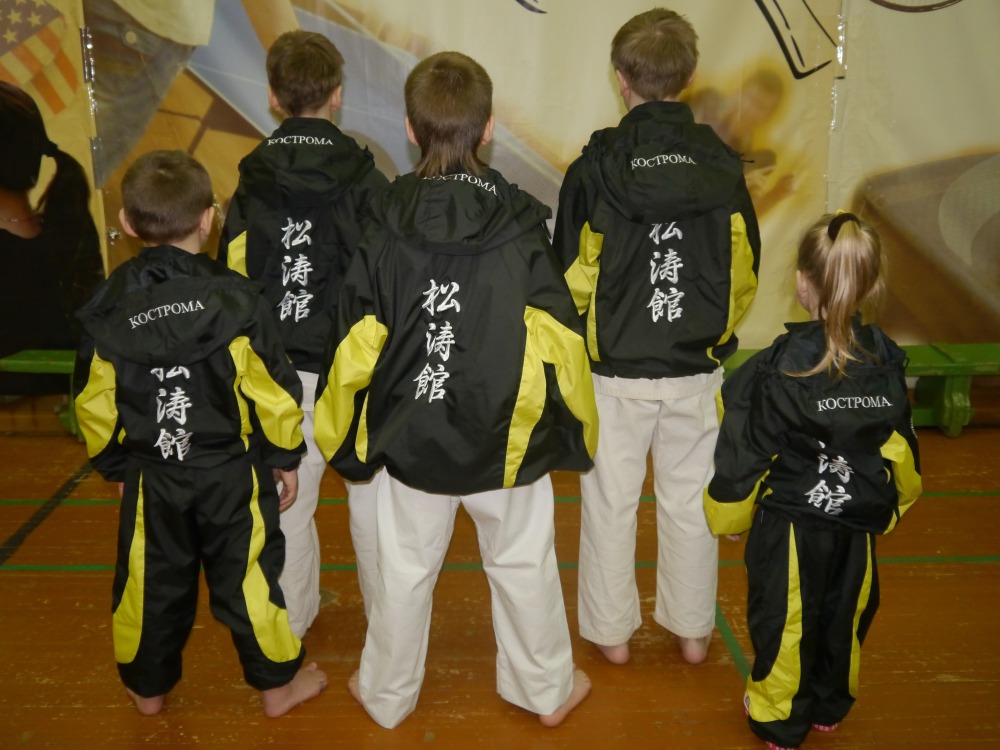 Цветовая гамма костюма подобрана в соответствии с официальными цветами Клуба - жёлто-черная. На груди слева вышита эмблема - символ стиля Шотокан - ТИГР. На правом рукаве - эмблема Клуба "Дэнто". Задняя часть куртки украшена иероглифами, обозначающими название стиля - ШОТОКАН: