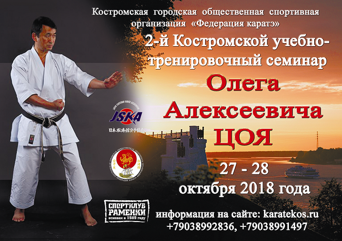27 октября по приглашению КГОСО "Федерация каратэ" в Кострому приедет с семинаром мастер спорта СССР, обладатель 7 дана Шотокан JKMO (Japan Karatedo Maruyoshikai Organization) Олег Алексеевич Цой.